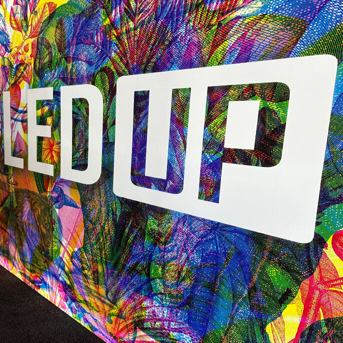 XXL LED-Messewand mit farbenfrohem Design und großem „LED UP“-Schriftzug.